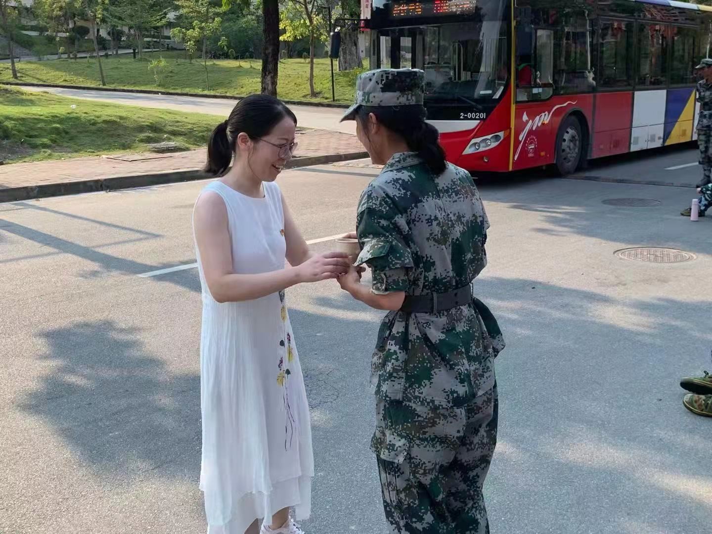 上午,化学化工学院学生党支部志愿者用冰糖、菊花以及枸杞等制作了消暑解渴的茶水。下午,在确保不影响军训训练进度的情况下邱树华书记一行与学生党支部志愿者将解暑茶搬运到服务点,并把解暑茶用水杯盛装好,分送到每一个参训学子手中,叮嘱大家在高强度的训练中要注意防暑和安全。期间,邱书记一行关切询问带训教官,对他们的辛勤付出表示感谢,对他们始终以良好的精神面貌投入到军训工作中表示赞赏。