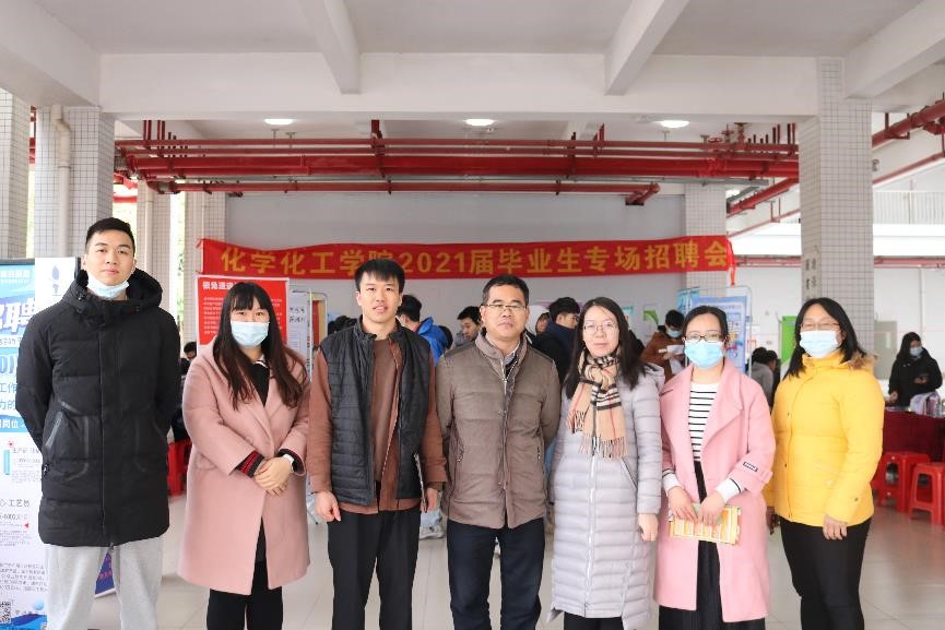 1月11日下午,化学化工学院于综合教学楼架空层举行中小企业招聘会。为了更好地了解企业情况与2021届毕业生招聘情况,化学化工学院院长舒绪刚、党总支副书记严丽纯、辅导员王正梅、刘亚宁、徐冠东、李珊珊、梁开华莅临本次受聘会作详细了解。