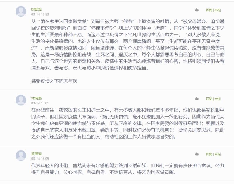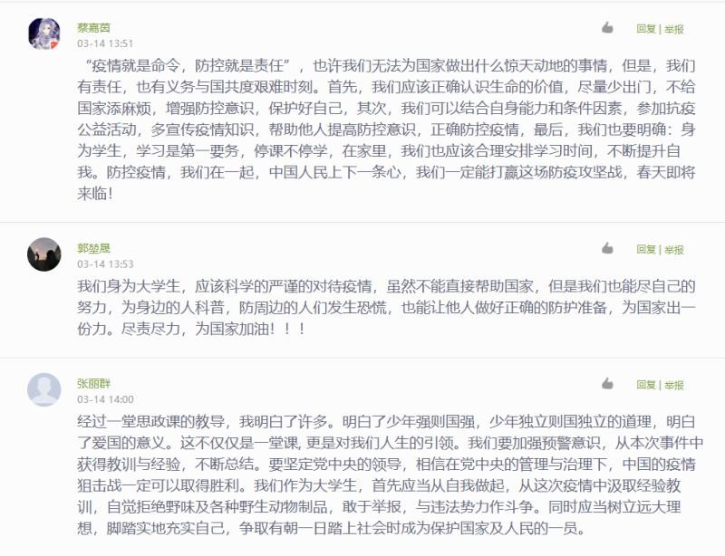 化工学院在组织学生集体观看完“广东省大学生2020年开学第一课”、“仲恺春季云上开学典礼”视频后,学生们纷纷留言表示:在这个疫情传染的特殊时期,将会严格听从学校安排,不得提前返校。此外,在家不仅会注意个人卫生,做到不造谣、不传谣、不信谣,而且还会自我督促,充分利用线上学习资源、积极参与到课程学习中,充实自身。