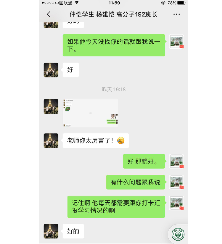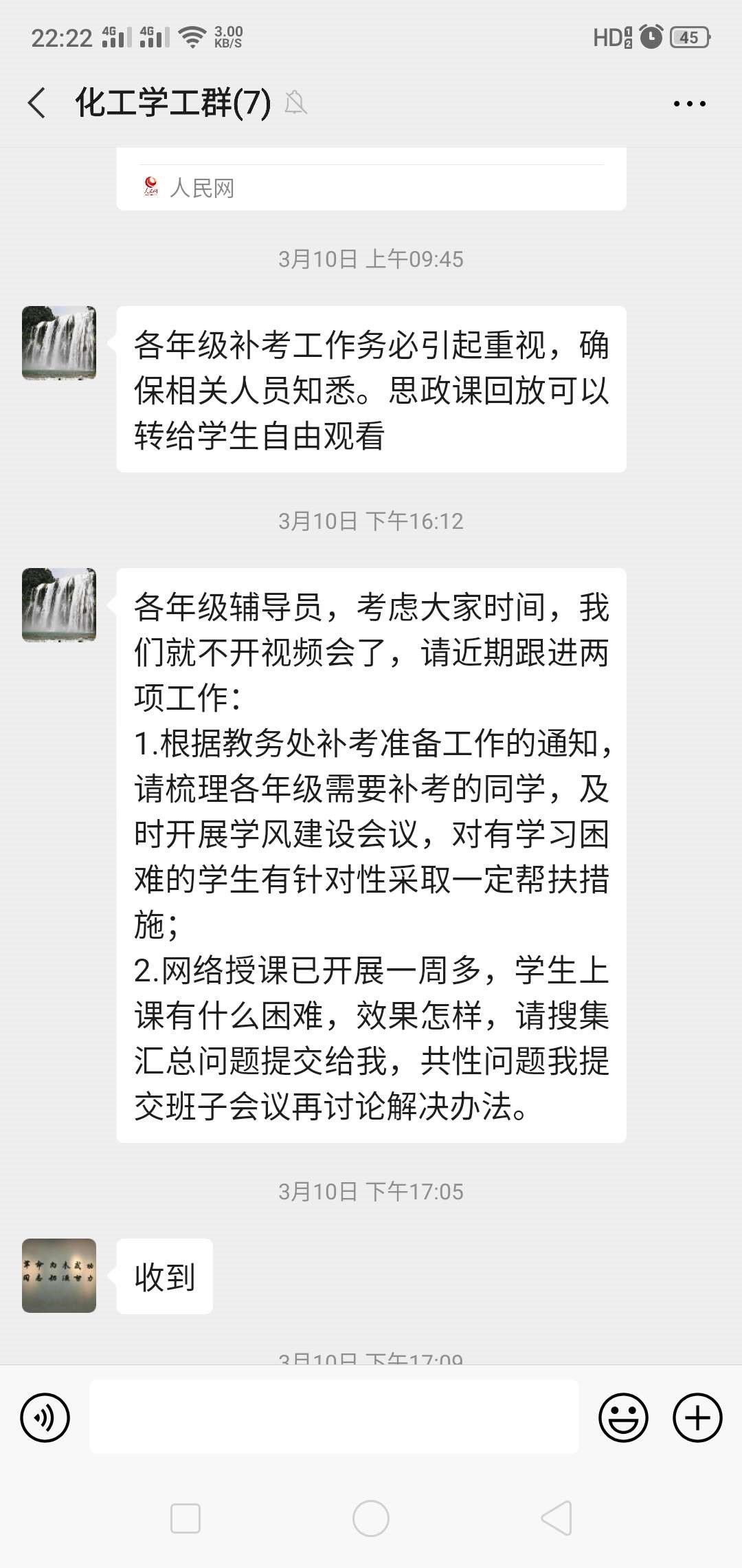 为充分调动学生线上学习积极性,端正学生线上学习态度,帮助学生快速投入线上学习,化工学院各年级召开了“宅家能自律,学习有动力”年级大会和相关主题班会教育,并强调:现在疫情情况有好转趋势,但仍不可松懈,出门要戴口罩,做好防护工作。尽量不出门,在家勤做锻炼,调整好作息,养足精神,提高课堂质量。各班班主任根据自身专业及班级学生特点,有针对性的引导学生努力上进。例如,17级的班主任们不仅积极鼓励考研学子宅家备考,而且对于选择就业的学生也给出择业建议,鼓励学生提前做好择业攻略。