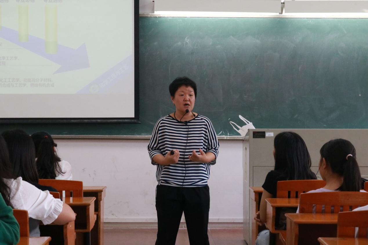 李英玲老师分别从专业概况、专业建设、专业学习三个方面对化学工程与工艺专业展开了详细的介绍。李英玲老师通过PPT放映与专业学生的实例细致地介绍了该专业的就业方向与就业前景,并且希望新生在专业课的学习上,每节课都要认真做好笔记,温故而知新。